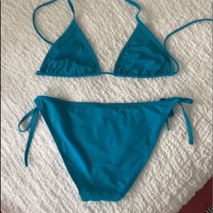 Size large Victoria’s Secret triangle bikini with side ties. The color is more aquamarine than it is in the pictures. Has hygienic tape in it. Brand new never been worn💙