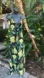 This is a beautiful moody tropical print on a black background lime green forest green Cali green a little bit of brown leaf design. We begin with adjustable spaghetti straps and this is a polyester semi sheer ship on. There is a 20 inch front side slit for movement. Beautiful dress in excellent condition