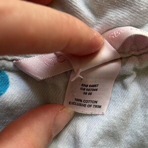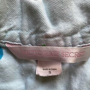 Victoria’s Secret two piece button down pajamas size S. Light blue with blue and green polka dots and green piping. Missing top button.