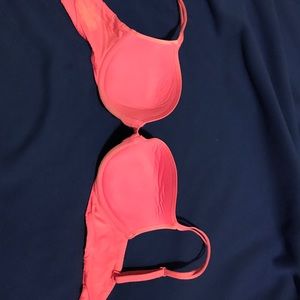 Victoria's Secret very sexy push-up bra size 34D. Hot pink with cute rhinestone in the middle. Straps are adjustable and can be moved to be cross back or halter. Barely worn!
