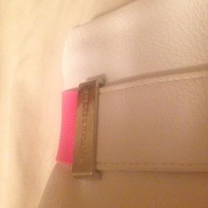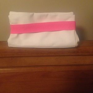 Victoria's Secret white clutch with a pink accent strap. The interior is pink as well. Never been used. Great for a night out to hold the essential items.