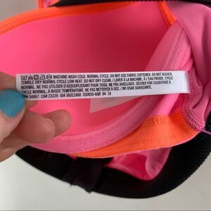 The wicking fabric and easy on-off of this Victoria’s Secret Sport front zip underwire sports bra with woven racer back straps. Pink, orange and black. Great support. Adjustable wider straps. NWOT. Please see photos for additional details.