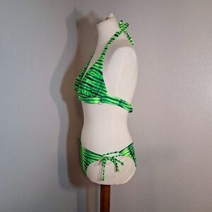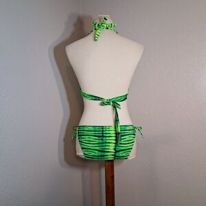 Stylish green and black zebra striped bikini. Halter top with adjustable tie back. Matching tie-side bottoms. Perfect for beach days. *Top and bottoms are different sizes. Top its a size medium, and bikini bottom its a size small. Pre-owned in good condition. Please refer to pictures for best description and condition verification.