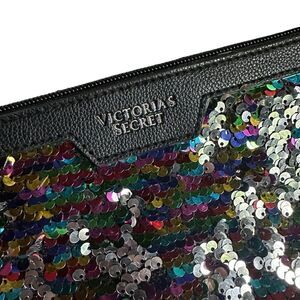 Victoria’s Secret Multicolored Sequined Clutch or Cosmetic Make Up Bag. Rainbow sequins can be swiped to make it black instead, back side is plain black. Outside of bag is faux leather or vinyl inside bag is a satin style fabric. Zip fastening. Bag is in great condition