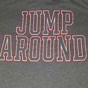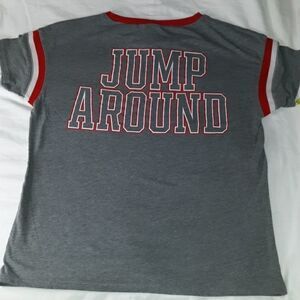 A UW University of Wisconsin Badgers shirt with a red sequin W on the front, and JUMP AROUND on the back. Red & white stripes on sleeves
