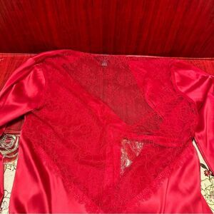 Victorias Secret red satin lace length robe kimono size M/L wrap around body tie beautiful lace trim across the back and on the ends of the sleeves two pockets great condition