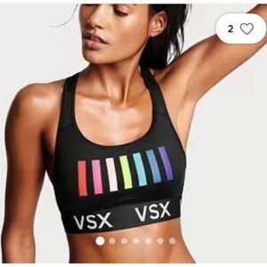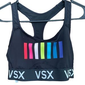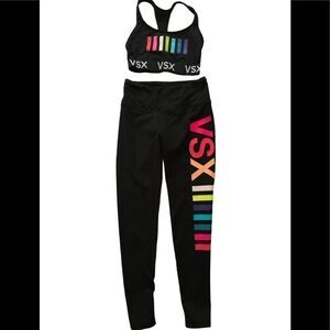 Victoria’s Secret Sport 2 piece sports bra/ leggings set, size S. VICTORIA’S SECRET SPORT KNOCKOUT TIGHT BLACK VSX RAINBOW LOGO WOMEN’S SZ S/P.Nylon elastic blend. Approximate measurements are waist flat 14”, waistband 3.5”. Rise 9”, inseam approximately 27”.