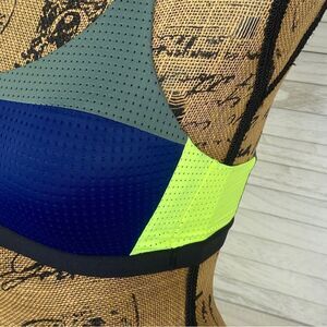 Olive green, navy blue & neon green color block, Perforated nylon fabric, Molded padded cups, Adjustable wide straps, Crisscross back, Pullover