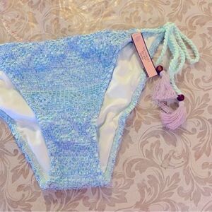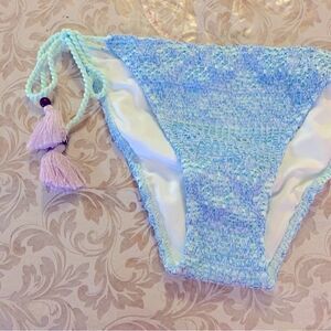 Victorias Secret Swimsuit String Bikini Bottoms Lined Blue Crochet & Purple Tassels Sz Small NWT