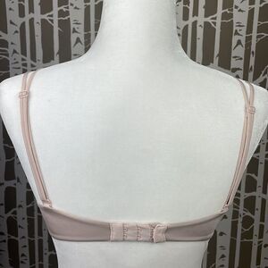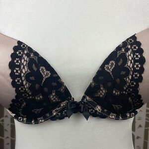 Victoria's Secret Very Sexy Push-Up underwire bra 32D beige with black lace. Features silky smooth nude stretchy satin, a pretty black lace accent on the front that reminds me of a butterfly, split straps that can be worn separated or together (pics 1 & 3), straight or criss crossed in the back. Gently worn with some signs of light wear: little bit of lint on the inside of the wire and a few very tiny snags on the band (see last 4 pics).