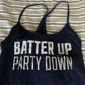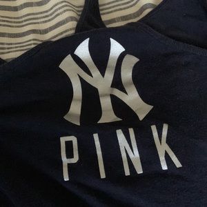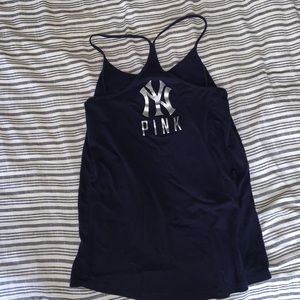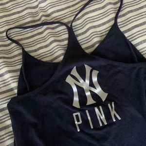 Victoria’s secret PINK women’s New York Yankees navy strappy tank top - Batter Up Party Down with silver lettering and Yankees logo