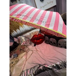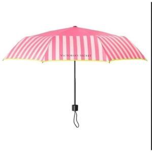 VICTORIA'S SECRET FULL COMPACT SIZE travel UMBRELLA perfect for Fall, Summer or Spring rain or Winter snow. Pink white signatureStripe Logo w/ Neon fluorescent brightYellow Green