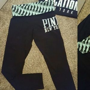 From nyc store yoga leggings and lightweight long sleeve tee it has hologram letters statue of liberty print on yogas really cute good condition worn only a couple times and hung dry