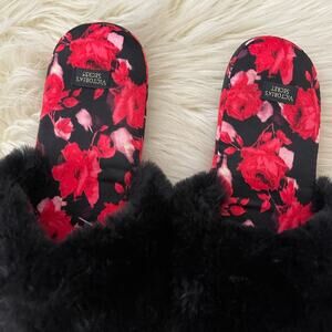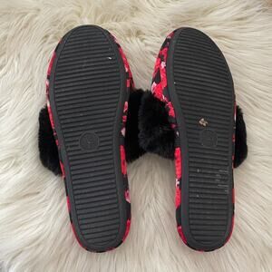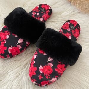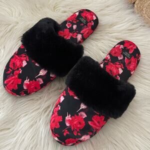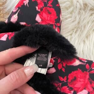 Victorias secret red and black floral print slippers size large. Thick cushiony sole. Comfy and cute! Worn maybe twice around the house - excellent condition.