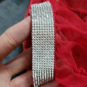 Adjustable and stretchy waist closure at back. Back features a flutter open back. Rhinestone waistband. Removable garter straps.