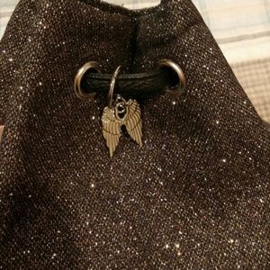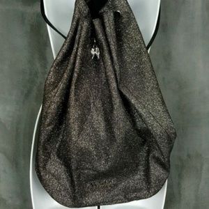Sparkley black drawstring bag. Leather straps, sparkles like the starry night sky. Has little metal angels wings dangling as an accent. And 'Victoria's secret' in small metal letters on the front