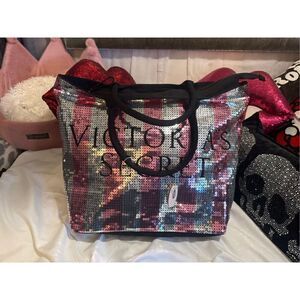 Victorias secret/Vs shopper tote beach bag black/pink signature stripe sequin
