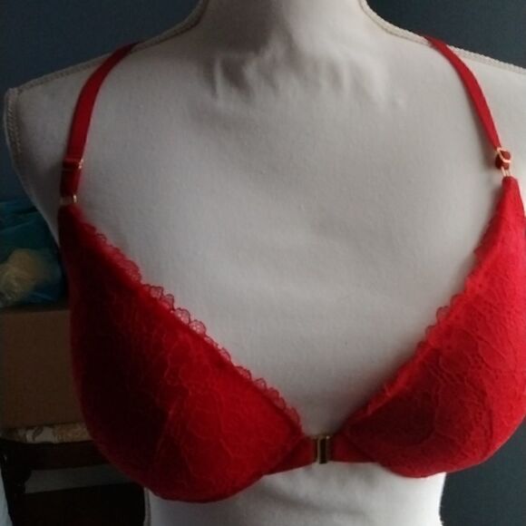 Beautiful red lace bra with gold hardware and chain up the middle of the back. Snap in front.