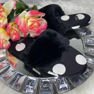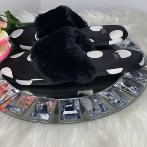 Victoria’s Secret Signature Satin Slip On Closed Toe Slippers. Color black with large white polka dots. Black faux fur trim. Memory foam footbed, rubber soles for traction. In excellent condition. Size S/P Fits US 5-6