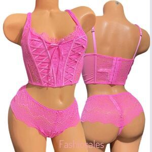 Victorias Secret Dream Angels Lace-up Corset Top Bra & Wide Side Thong Pink L