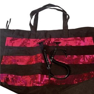 NWOT ~ Features bold hot pink sequin stripes on the front and back. A large VS logo in shiny black is on the front as well. The handles are of the same fabric as the tote. A silver tone VS charm is attached to the zipper. This is perfect for a weekend getaway, or a trip to the beach. Measurements are appx: Height: 14", Length: 24", Width: 5.75", Strap: 10", see pics.