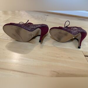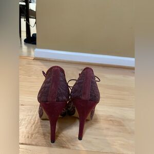 So cute and fashionable! These size 7 Victoria’s Secret burgundy/maroon lace up ankle booties have the Victoria’s Secret gold Angel emblem on the bottom. Worn only once. No flaws.