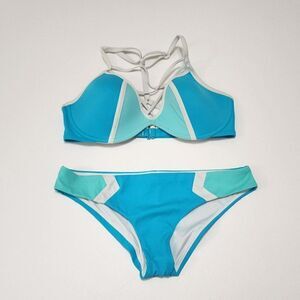 Victoria`s Secret PINK- M (D-DD)Aqua Blue Strappy Front Bikini Top & Bottom