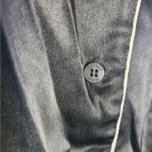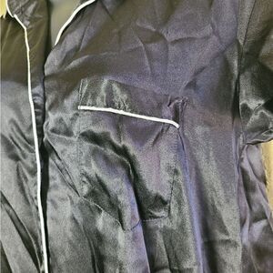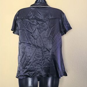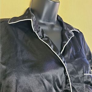 This is a black button-up pajama top by Victoria's Secret. It has white piping and is short sleeved. There is a small chest pocket.