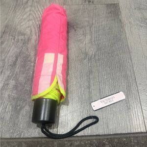 Stylish compact umbrella. Features pink and neon green stripes. Easy to carry with black handle.