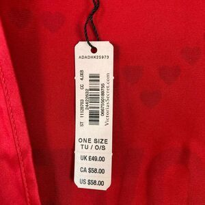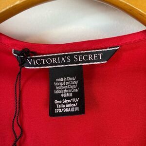 This Victoria’s Secret robe features a kimono style sleeve, red color, the word “LOVE” in a heart on the back, tie closure, ruffled front and sleeves.