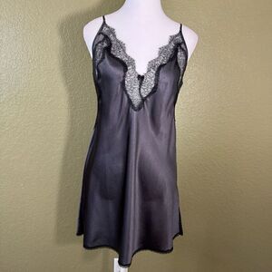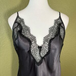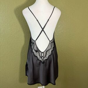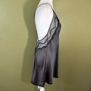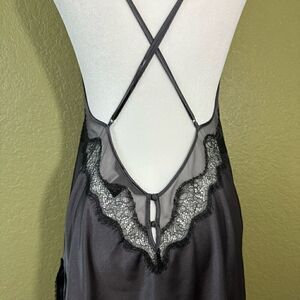 Victoria's Secret Womens L Open Back Satin Chemise Nightie Gray Black Satin Lace Trim