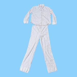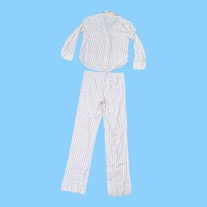 This pajama set features a button-up shirt and full-length pants with a white and pink striped pattern. Designed for breathable comfort with 100% cotton material.