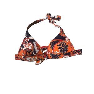 Victorias Secret bikini top orange background with navy blue and white colors with a gold oval center size S. Halter style with tie around bodice. Padded cups.