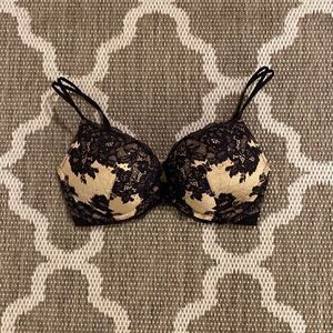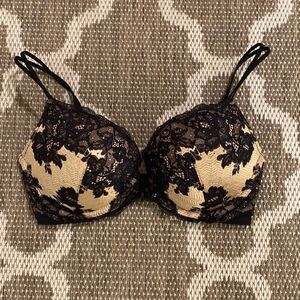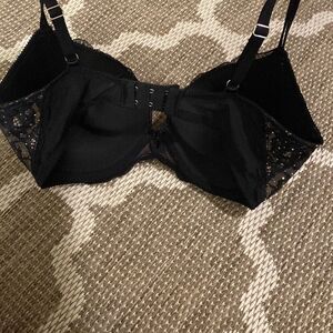 Victoria’s Secret bra size 34DD this is the push-up bra by Victoria’s Secret. The colors are black and gold. It has black rhinestones on the lace part of the bra. The backstrap has a mesh band in good preowned condition normal wear and tear. See pictures for more details. Super super cute.