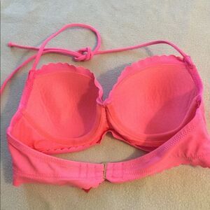 Victoria’s Secret 32B getaway Halter Pink Ruffle bikini swim top, ruched front, back hook closure, lined, padded underwire. Stock pic shows a similar but not exact style as my item.