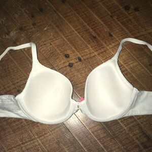 Off white, lace and pink ribbon trimmed, soft lined perfect coverage bra. In good, used condition. From a pet and smoke free house. Happy to bundle!