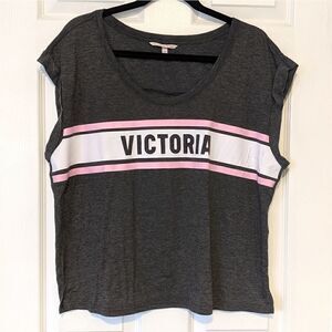Victoria's Secret Gray Wide Neck Oversized Tee size large. Pink and white stripe on front says Victoria. Some cracking on the stripe as shown in photos. Otherwise in good, pre-owned condition. Please comment with any questions. :)