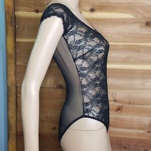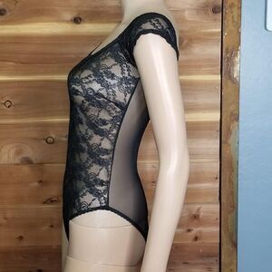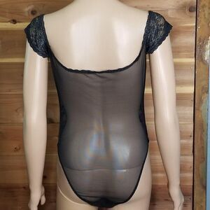 Black and metallic colors, floral pattern, scoop neckline, short cap sleeves, sheer and lightweight material.