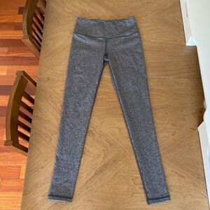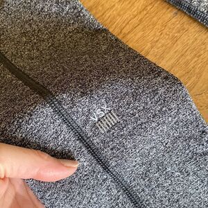 Gray running and athletic tights by Victorias Secrets VSX Sport line. Gray compression material dries fast and holds everything in with a large, flattering band at the waist. One hidden pocket at the waist perfect for stashing keys or gel.