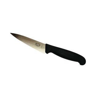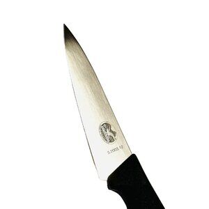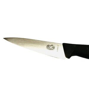Victorinox small chef knife, 5" stainless steel straight edge blade, with black fibrox handle. Model number 5.2003.12. Made in Switzerland. This knife is new old store inventory.