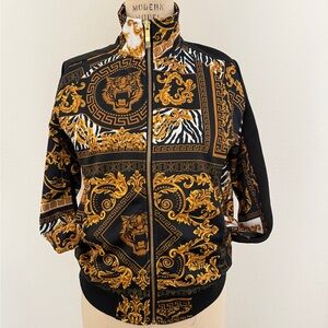 Victorious zip up track style jacket with gold and black tiger/flower print.