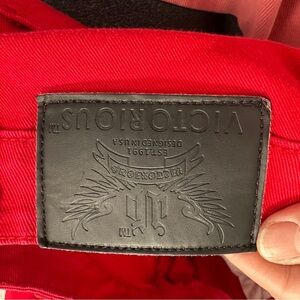 Bright red Victorious jeans in a size 34x32 twill. Skinny leg, 97% cotton, 3% elastane.