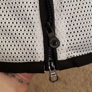Black and white mesh jacket with Victory logo on the back.