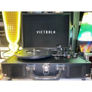 The Victrola Journey+ Bluetooth Record Player combines classic design with loads of new features! Dual Bluetooth connectivity allows you to stream your favorite vinyl records to any external Bluetooth speaker, or stream music from a smart device through the built-in stereo speakers, so you can truly make your listening experience your own. The 3-speed turntable plays all 33 1/3, 45, and 78 RPM records, or plug in your favorite pair of headphones. The Journey+ is equipped with an easy-carry handle, and its portable design means you can take your tunes on the go, for lasting music memories wherever you may be. Also includes spare needle and cleaning cloth