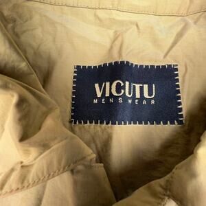 Sleek and modern beige trench coat by Vicutu Menswear, estimated to fit a Men’s Medium. This lightweight layering piece features a minimalist silhouette with a hidden button placket, pointed collar, and two slant front pockets. The neutral tone and tailored fit make it perfect for capsule wardrobes, streetwear, or business casual vibes. Fully lined with Vicutu-branded buttons and soft woven construction—ideal for transitional weather.