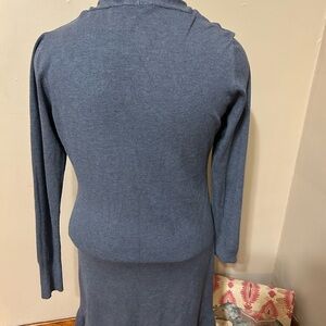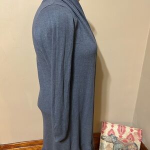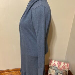 This Vida Milano women's sweater is a soft wool blend duster cardigan in size medium-large. It features a solid gray color with a tight-knit fabric and long sleeves. The sweater has a relaxed fit with ruffle accents, making it suitable for various occasions like travel, parties, casual outings, and business settings. The collarless pullover style has a minimalist, preppy, and chic theme, perfect for the seasons of winter, fall, and spring. Shows some light piling on right front side but it is hard to do