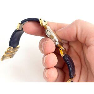 This is a blue and gold vintage Vienna wristwatch. The bezel is round shaped with blue sections along the bracelet. Dial is mother of pearl.