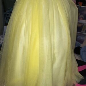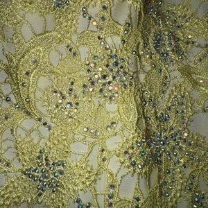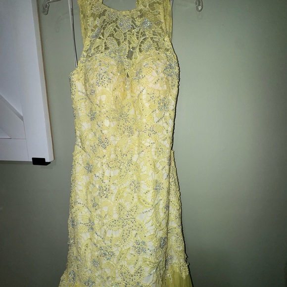 Stunning yellow lace dress with intricate detailing. Perfect for special occasions. Backless design adds elegance.
