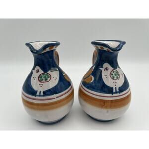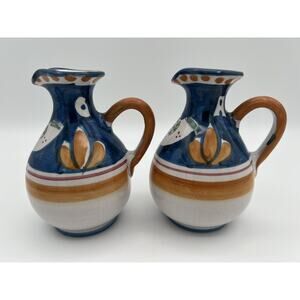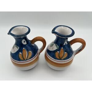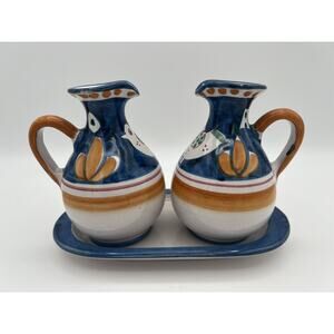 Vietri Italian Pottery Solimene Hand Painted Oil & Vinegar Cruets with Under Plate. Good condition, no chips or cracks. The oil cruet has a tiny spot that looks like a paint chip or perhaps where the paint missed during production (see photos). The cruets do not have stoppers. Cruets measure approx. 5” tall. Under plate measures approx. 7.75” x 4”