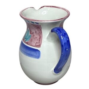 This piece was created by Vietritaly S.R.L. and features a whimsical hand-painted chicken design in pink, teal, and soft blue brushstrokes over a creamy white glazed base. Handmade and hand-painted using traditional techniques, it has a rustic, folk-art feel that works beautifully as a display piece or a functional jug for water, flowers, or wine.